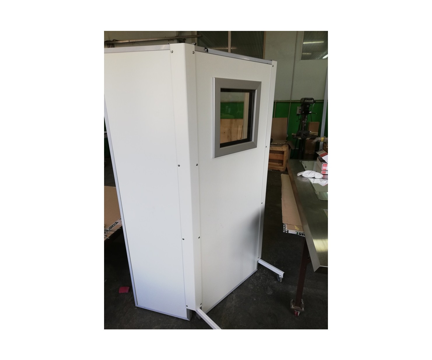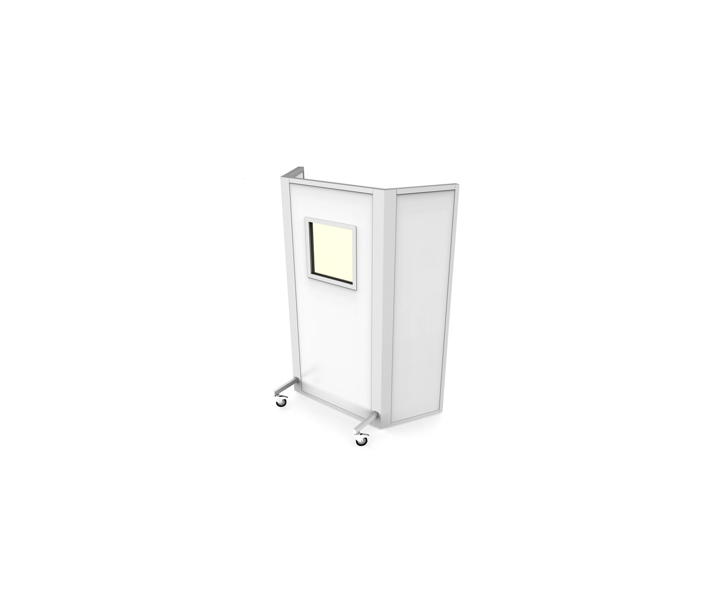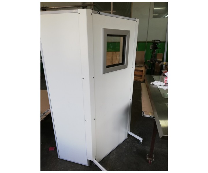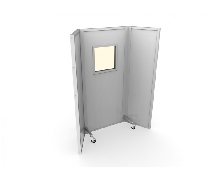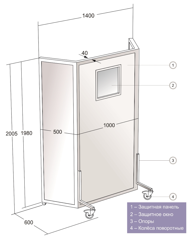 Ширма установлена на поворотных колесах имеющих стоповую фиксацию и имеет внешнюю отделку из стали оцинованной окрашенной, внутреннее заполнение защитным материалом (лист свинцовый марки С1). Для исключения разрывов защиты, заполнение защитным материалом производится по всей площади ширмы с перекрытием по местам стыка. Торцы панелей защищены алюминиевым профилем с анодированным или порошковым покрытием.