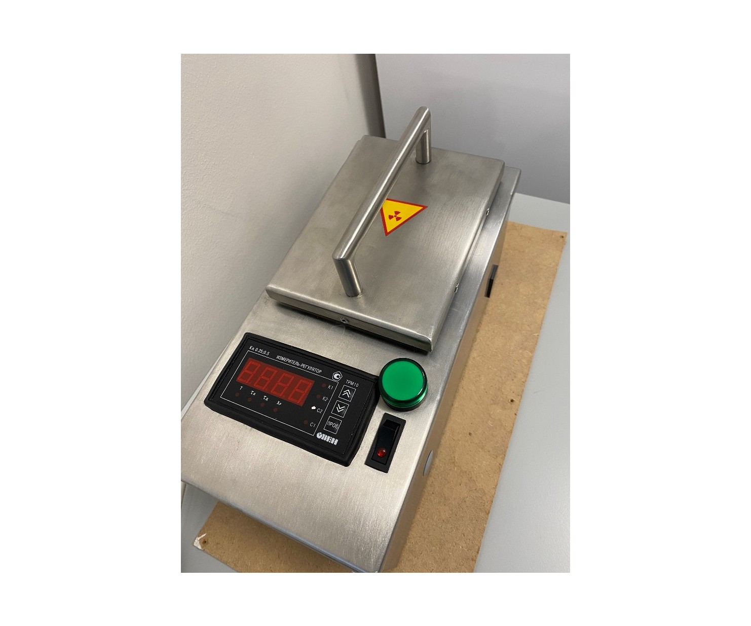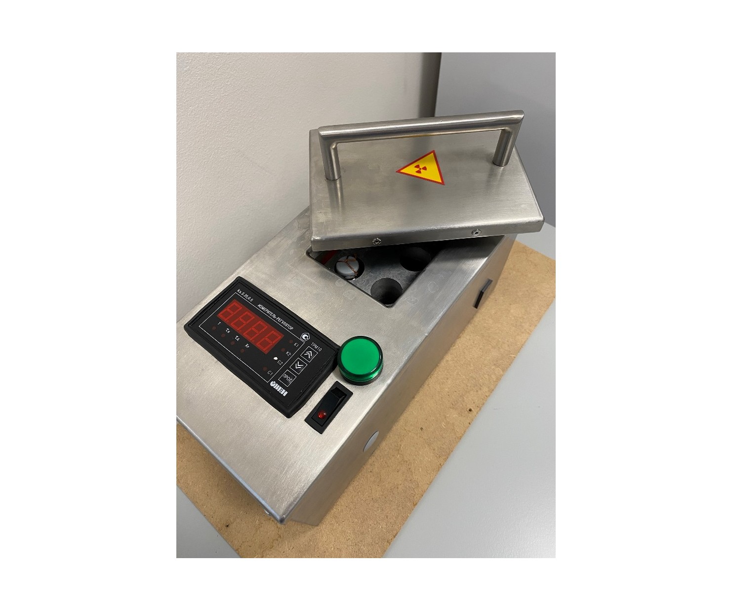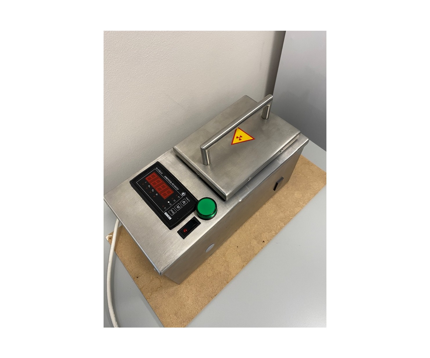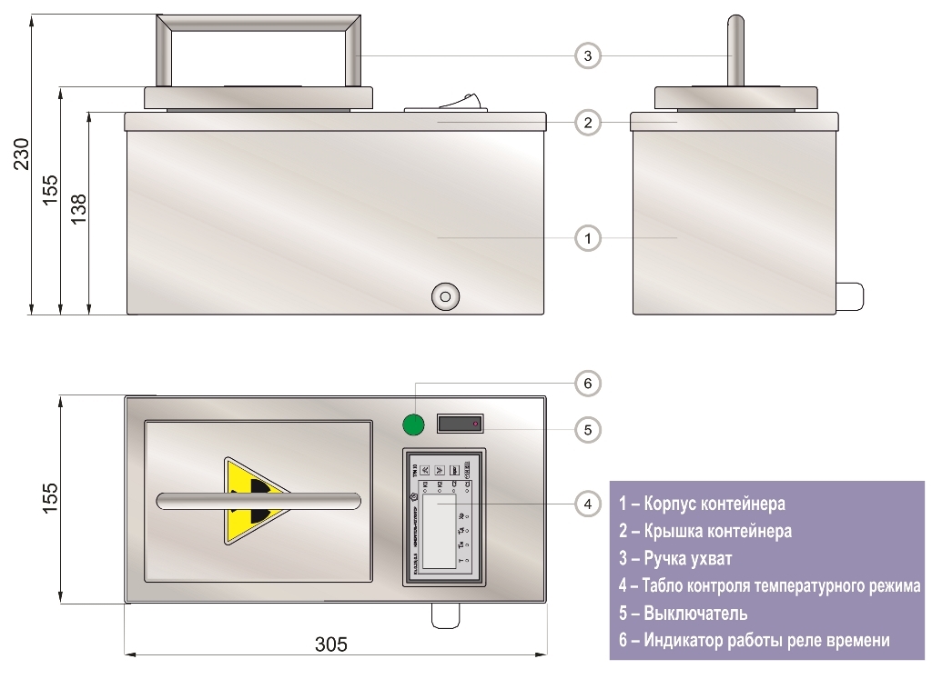 Контейнер выполнен из нержавеющей стали AISI 304. Корпус контейнера по всей площади экранирован защитным материалом (свинец). Контейнер имеет шесть ячеек для позиционирования флаконов с радиофармпрепаратами и оборудован электроникой для контроля и регулировки температуры нагревания флаконов.