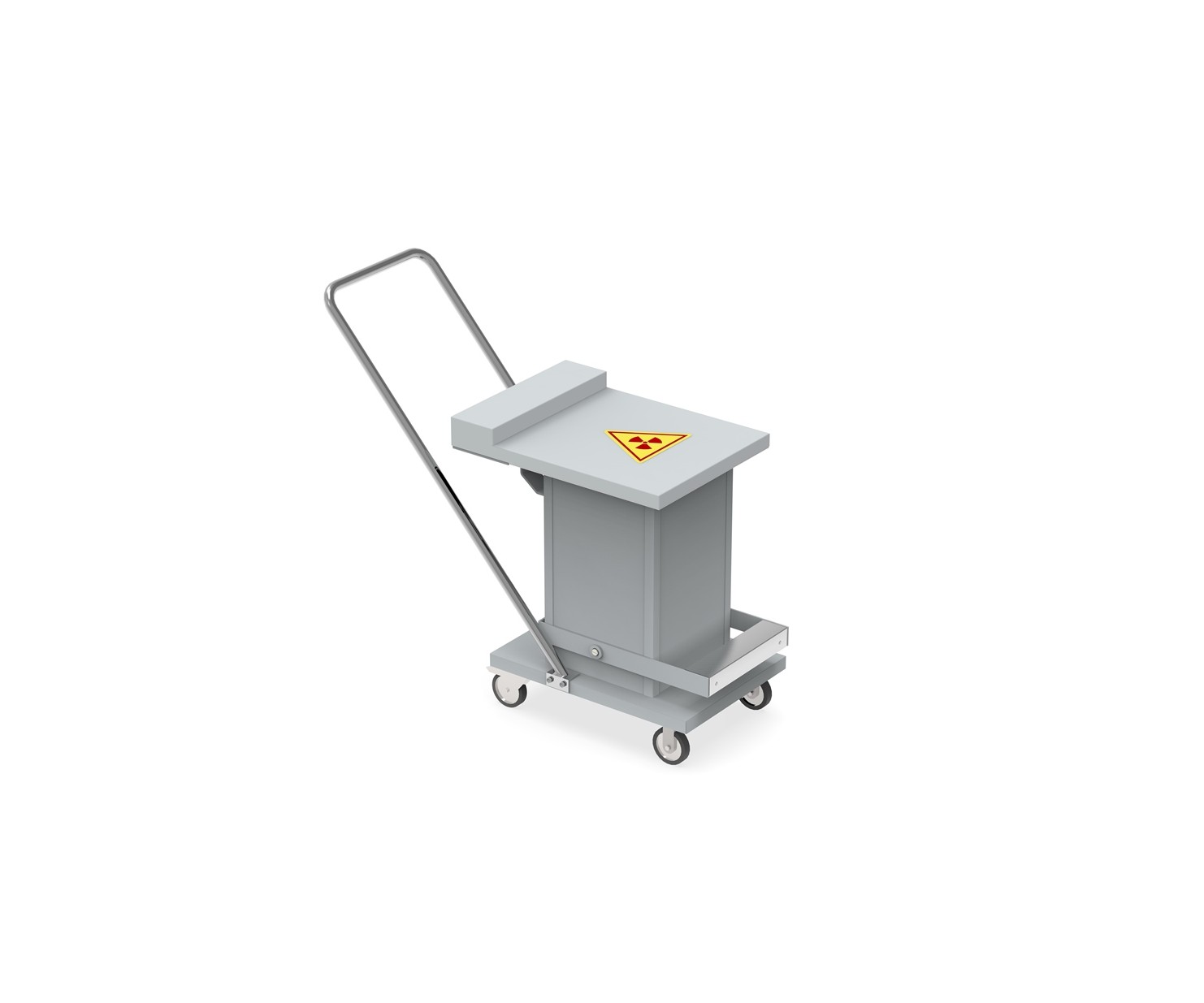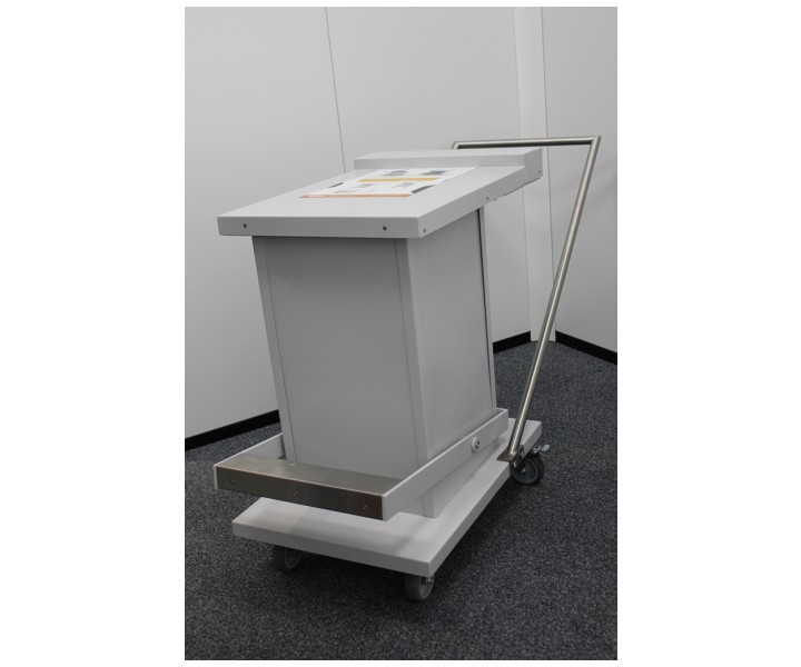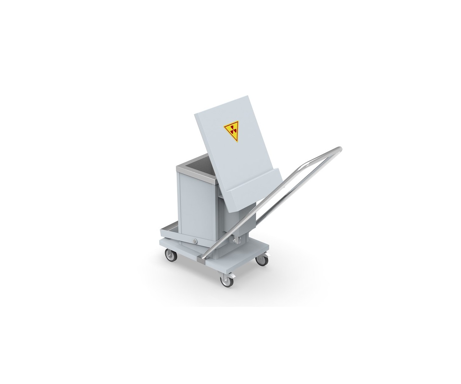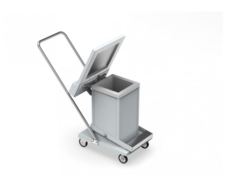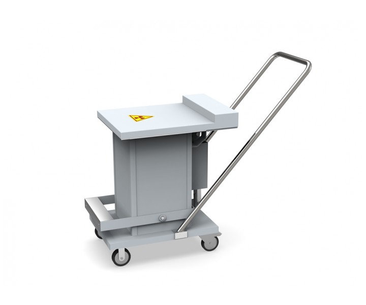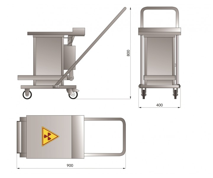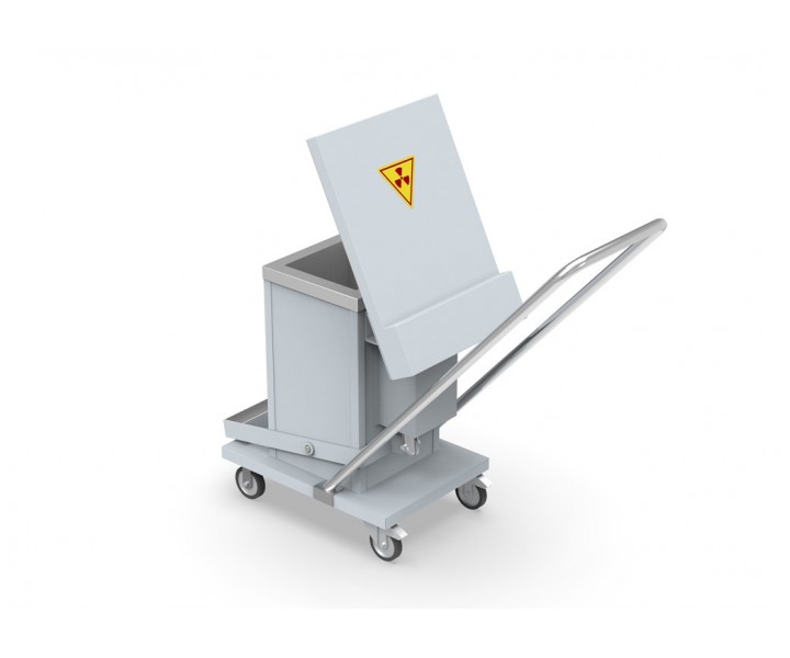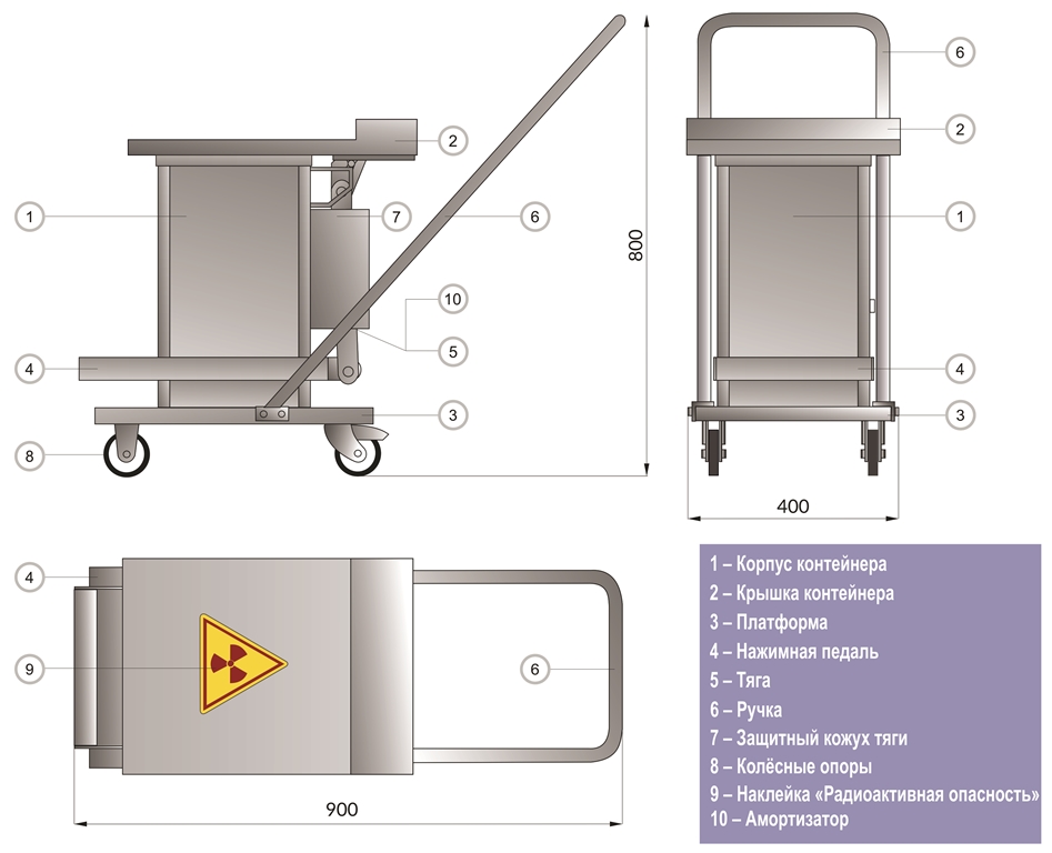 Контейнер представляет собой конструкцию, зафиксированную на платформе. Внутренняя емкость контейнера выполнена из нержавеющей стали AISI 304 и экранирована по периметру защитным материалом (свинец). Для удобства перемещения платформа имеет четыре колесных опоры со стоповыми фиксаторами и металлическую рукоять. Контейнер оборудован откидной крышкой. Для удобства открытия предусмотрен ножной педальный механизм.