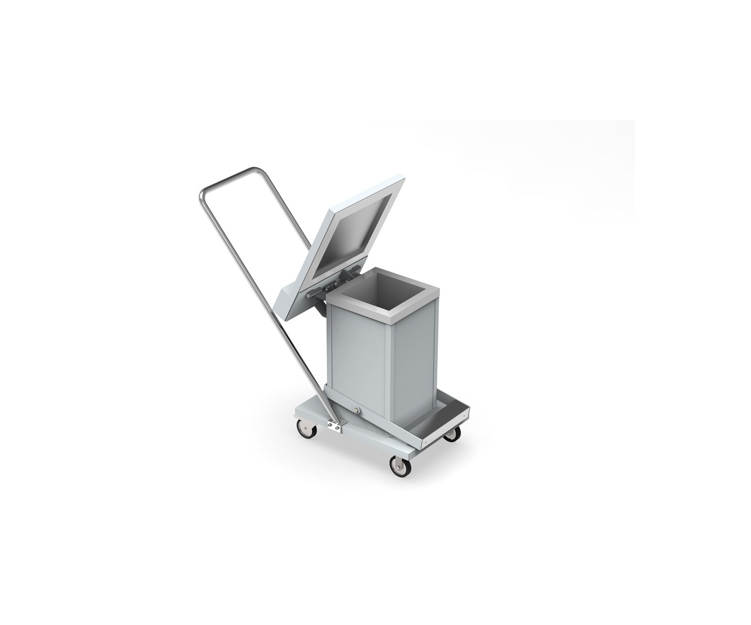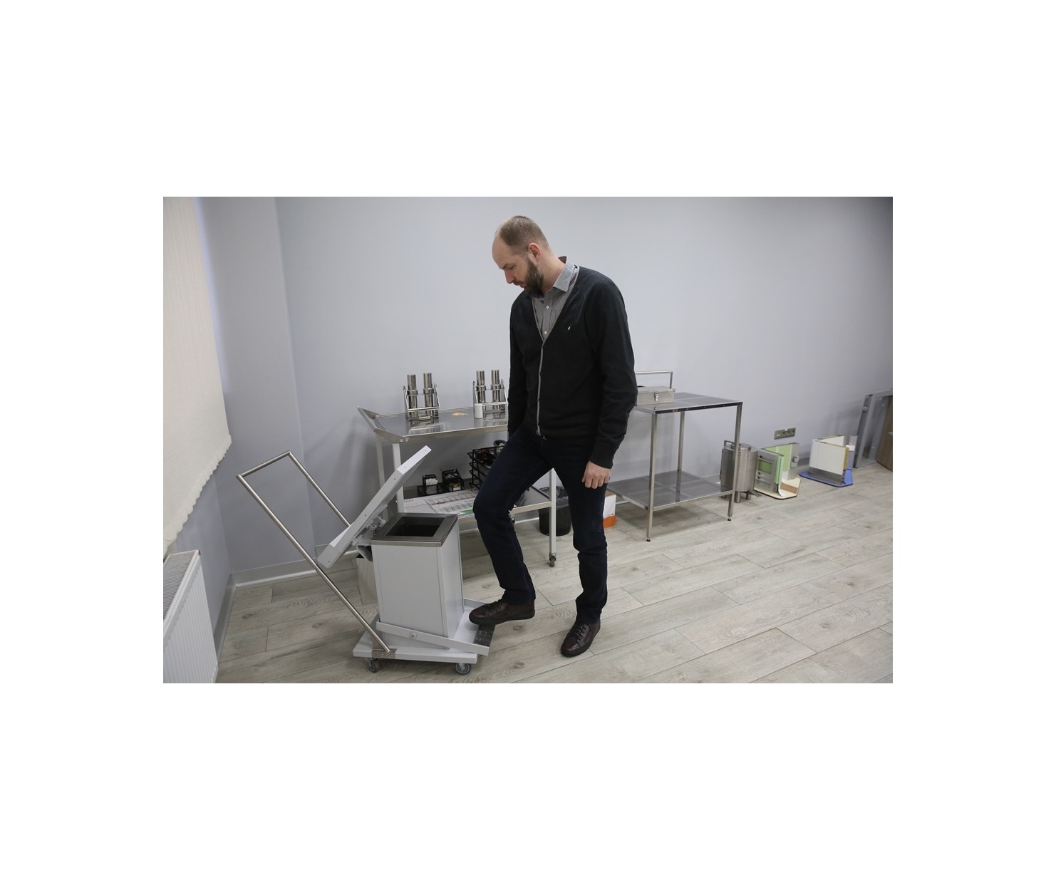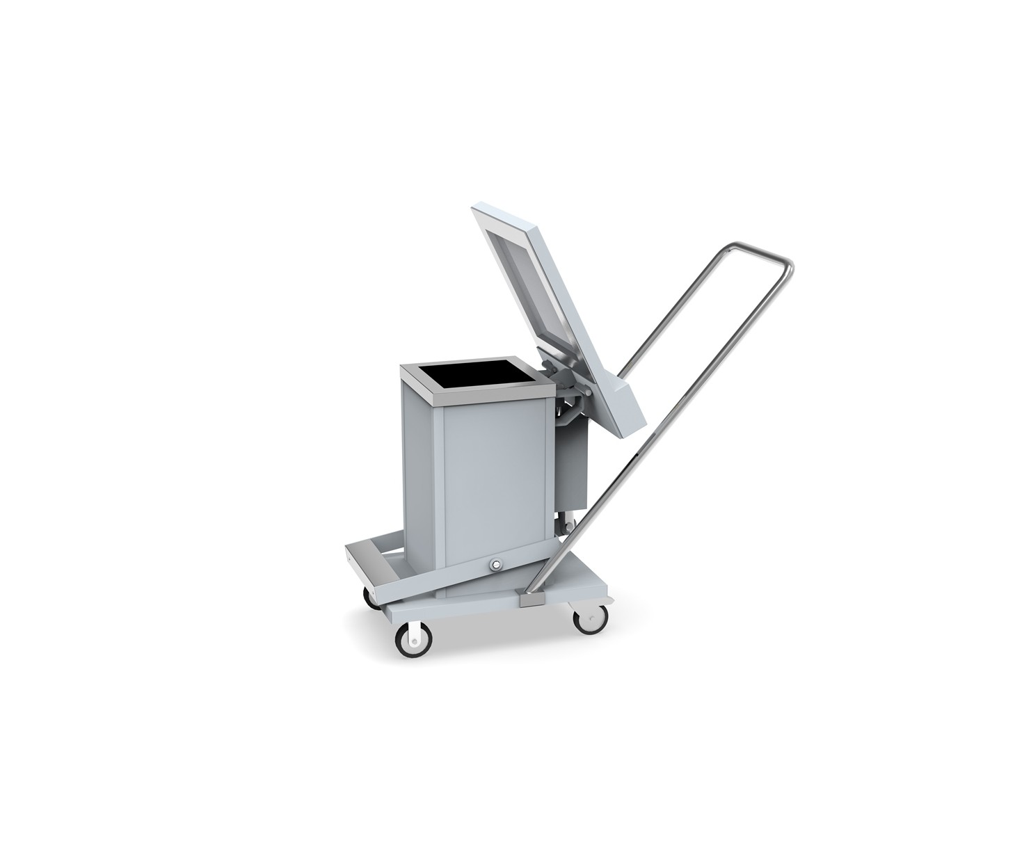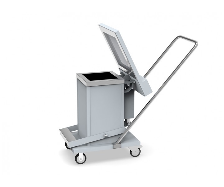 Плавное закрытие крышки обеспечивает гидравлический амортизатор. При нажатии на педаль крышка люка поднимается, обеспечивая доступ внутрь контейнера.
