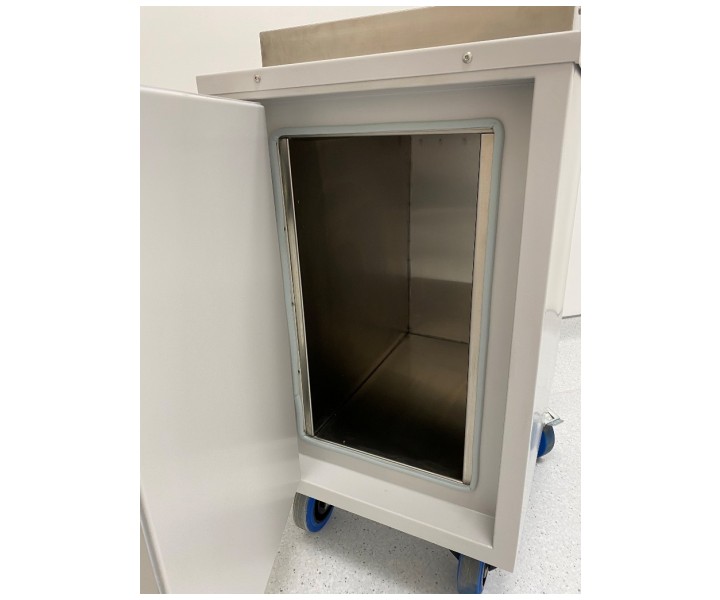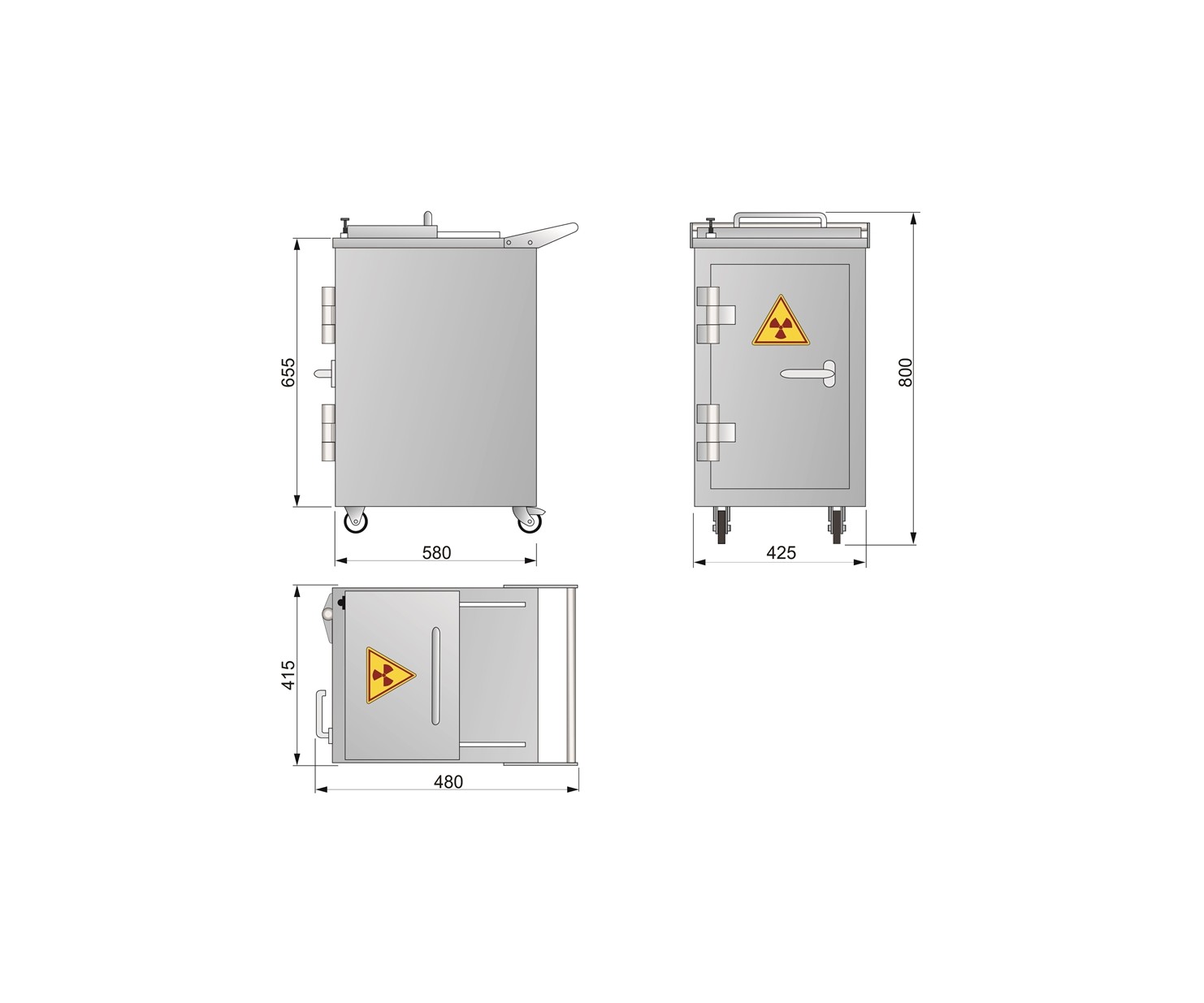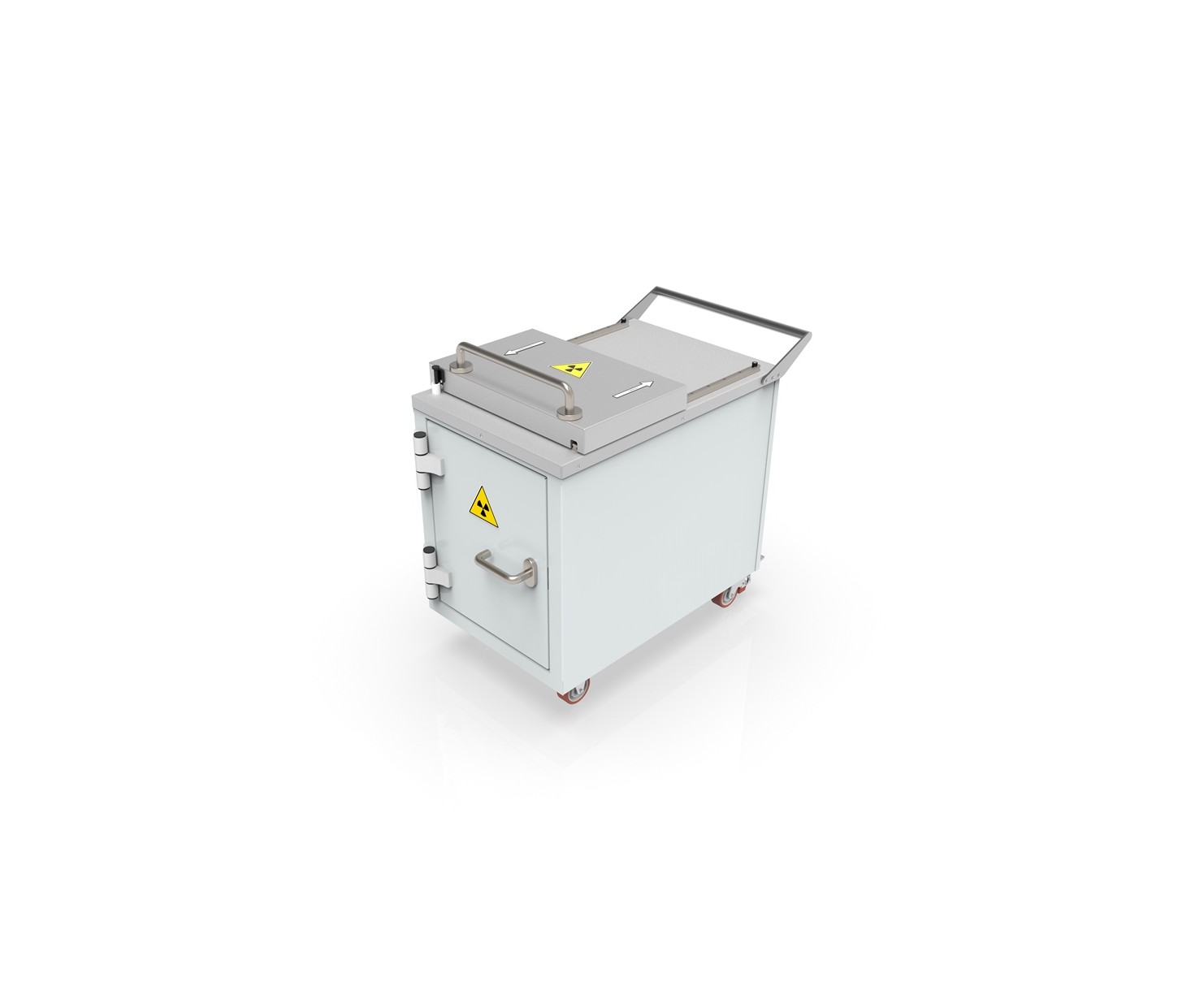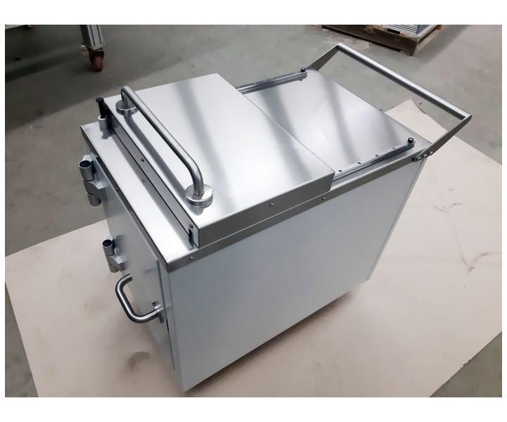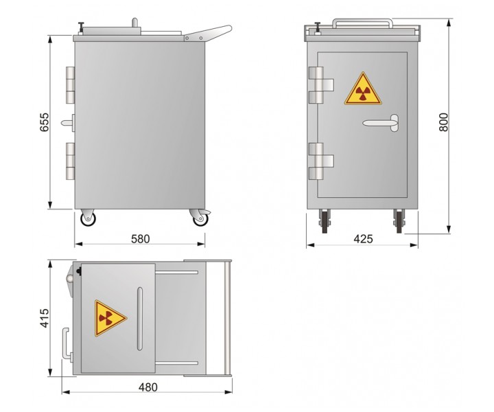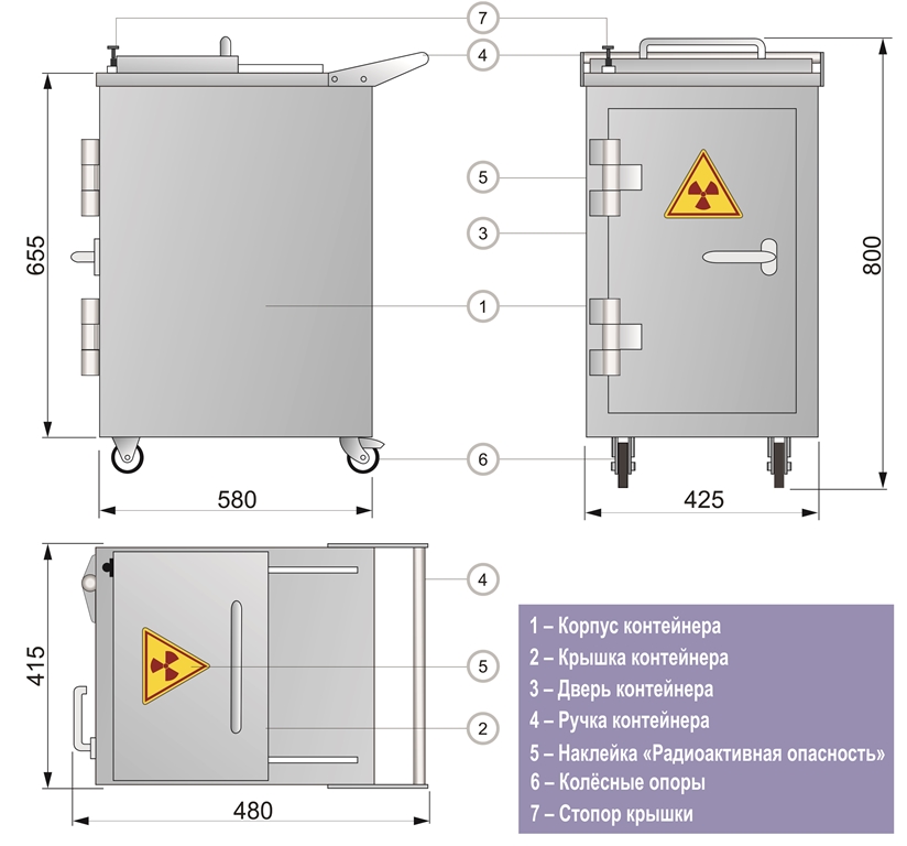 Контейнер представляет собой конструкцию, зафиксированную на платформе. Внутренняя емкость контейнера выполнена из нержавеющей стали AISI 304 и экранирована по периметру защитным материалом (свинец). Для удобства перемещения платформа имеет четыре колесных опоры со стоповыми фиксаторами и металлическую рукоять. Контейнер оборудован сдвижной крышкой для загрузки и боковой дверью для извлечения твердых радиоактивных отходов.