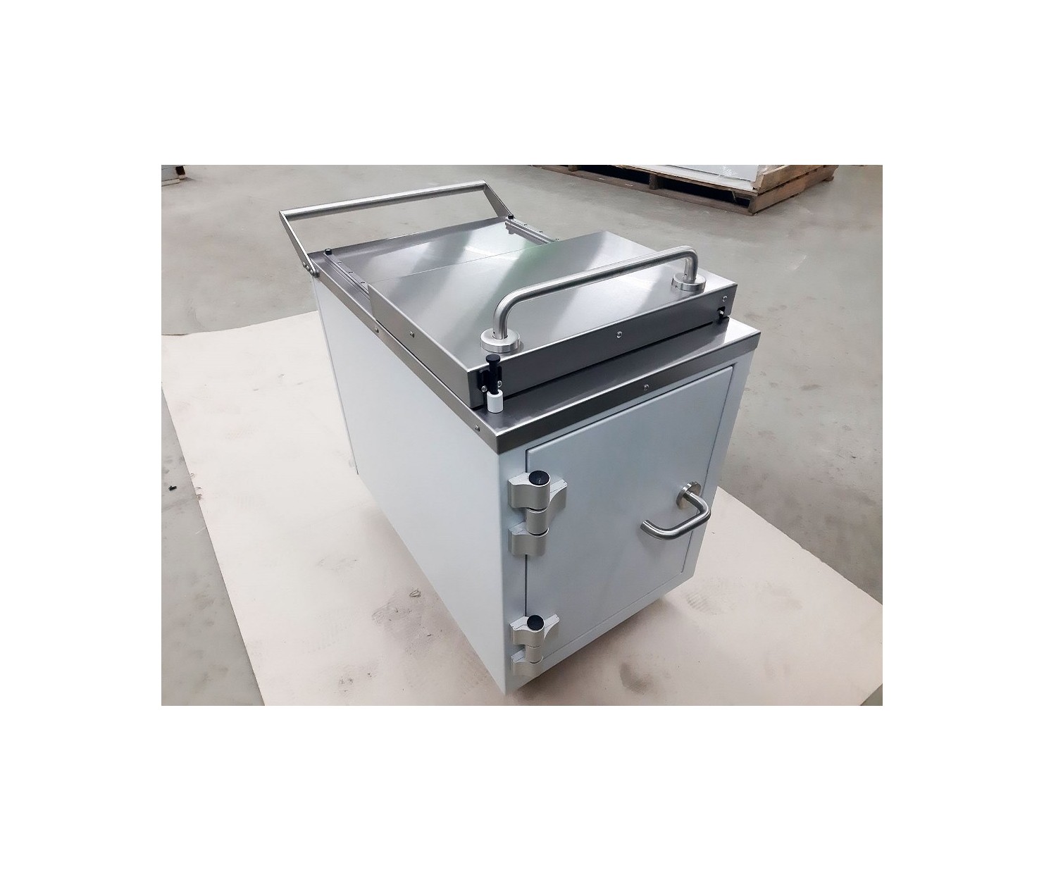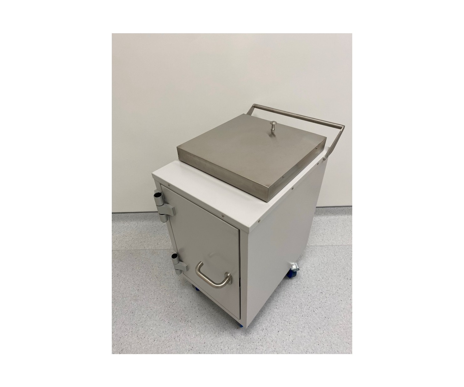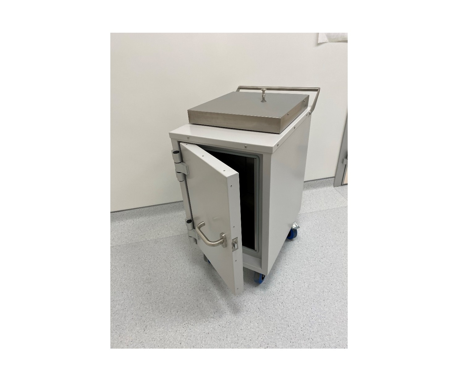 Контейнер представляет собой конструкцию, зафиксированную на платформе. Внутренняя емкость контейнера выполнена из нержавеющей стали AISI 304 и экранирована по периметру защитным материалом (свинец). Для удобства перемещения платформа имеет четыре колесных опоры со стоповыми фиксаторами и металлическую рукоять. Контейнер оборудован сдвижной крышкой для загрузки и боковой дверью для извлечения твердых радиоактивных отходов.