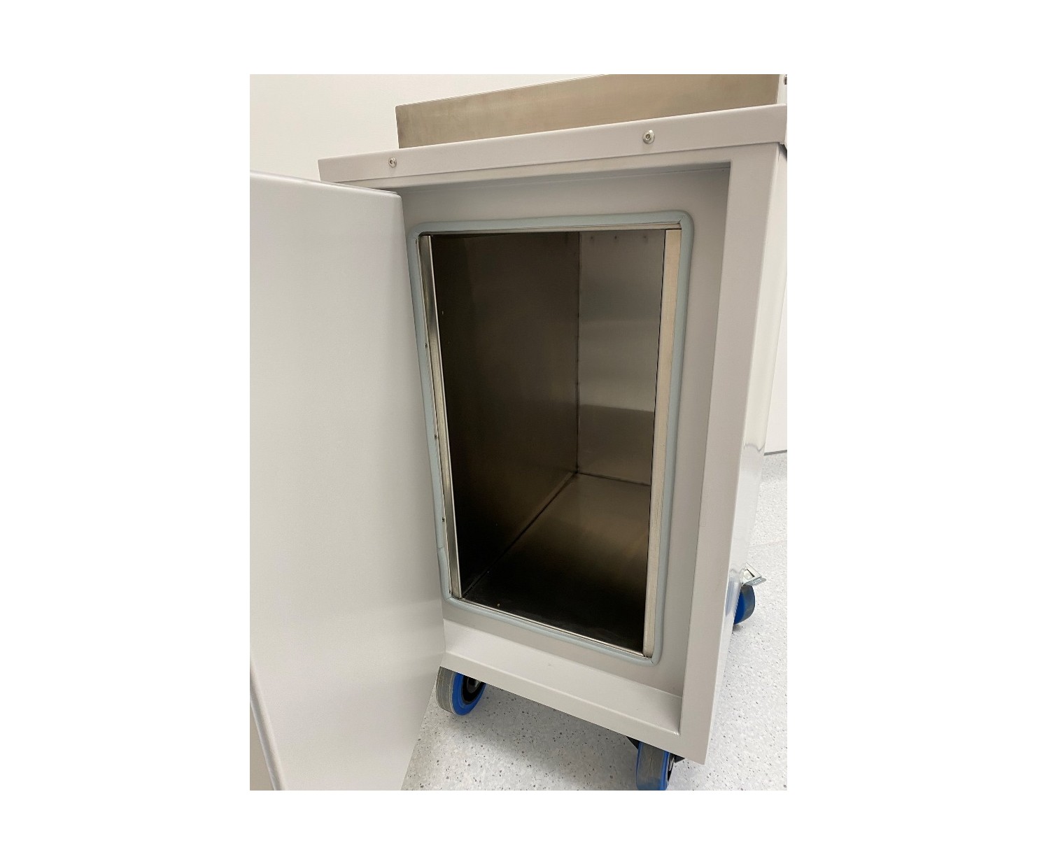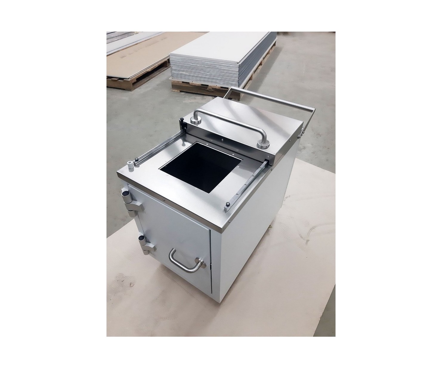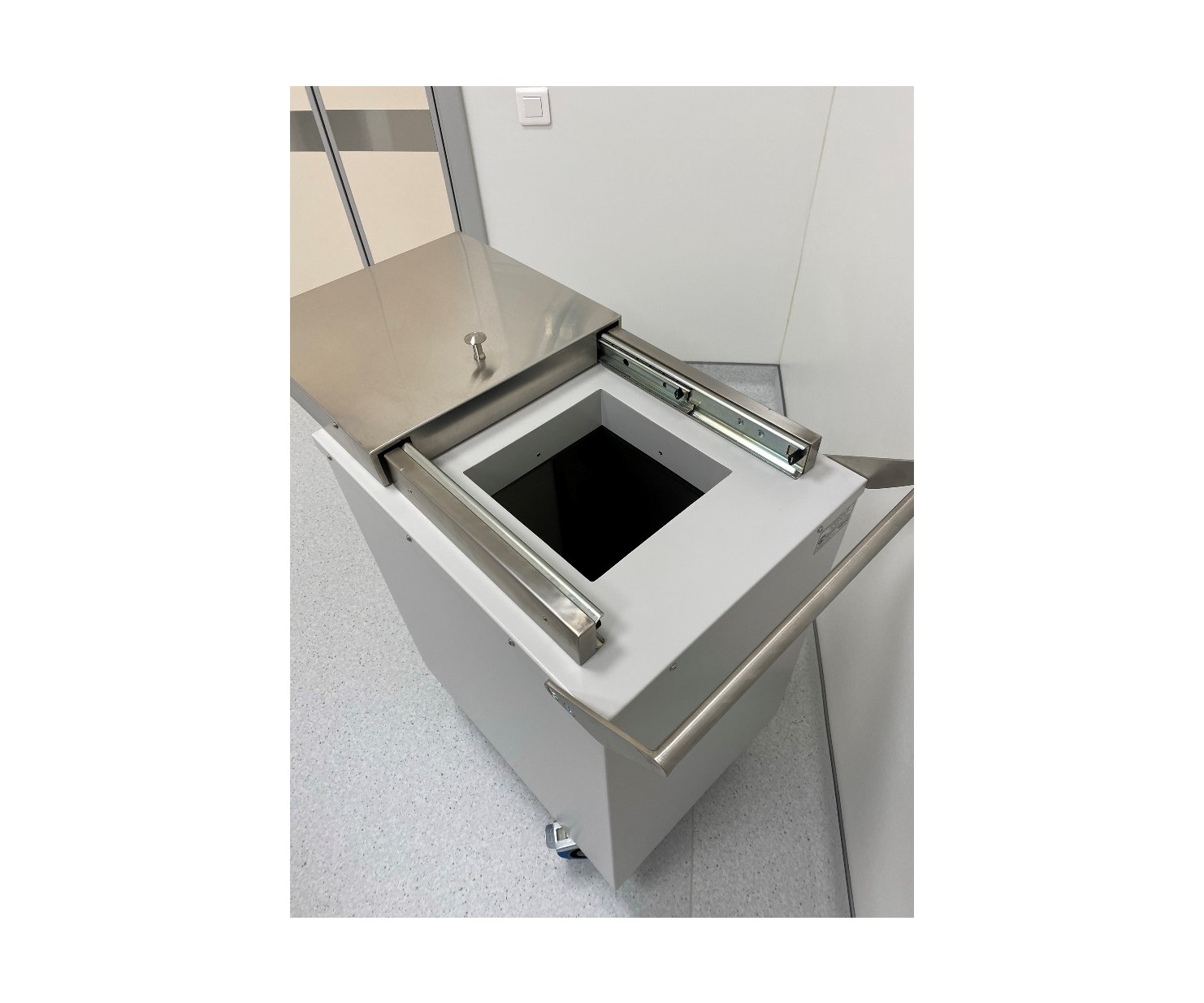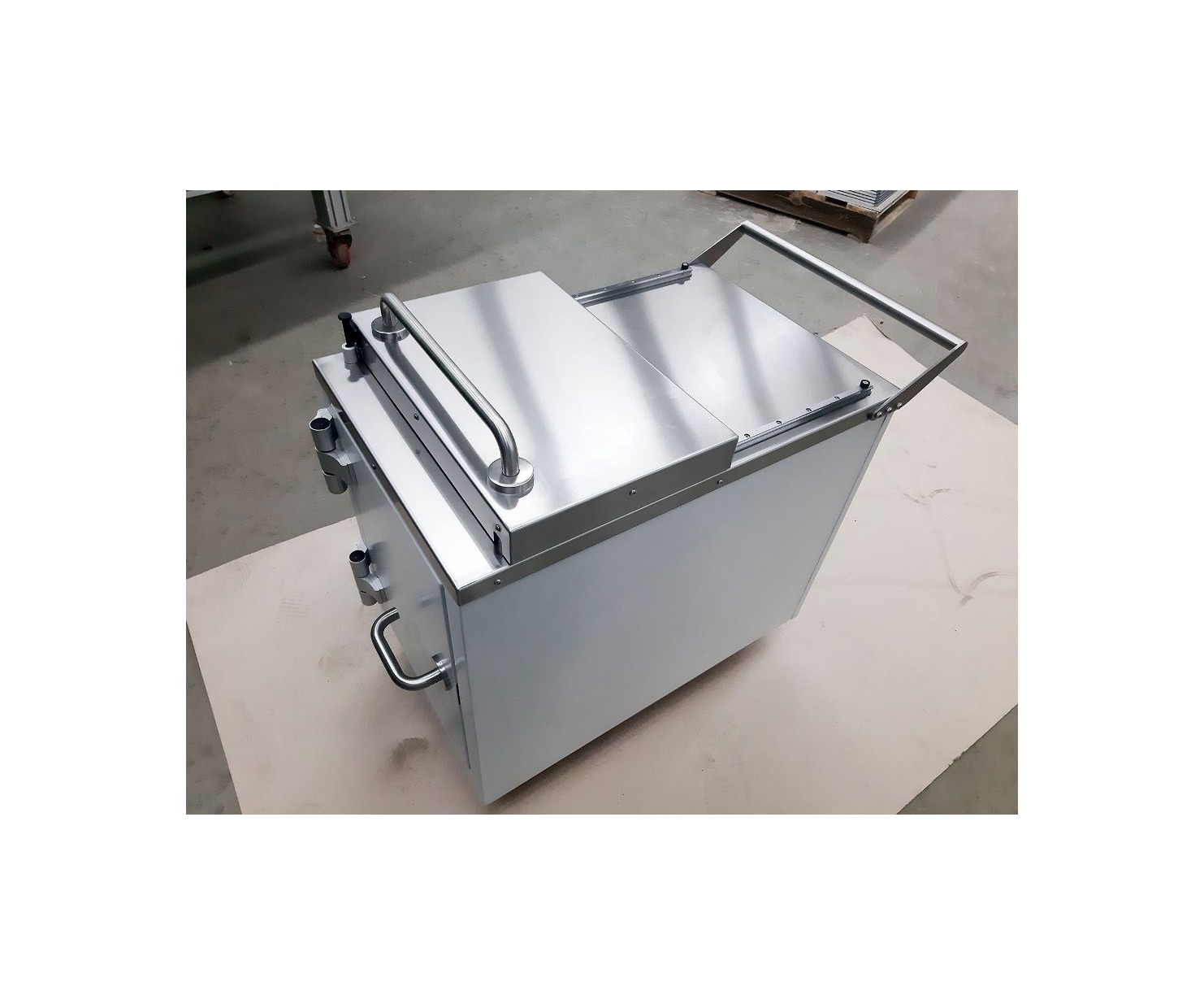 Контейнер представляет собой конструкцию, зафиксированную на платформе. Внутренняя емкость контейнера выполнена из нержавеющей стали AISI 304 и экранирована по периметру защитным материалом (свинец). Для удобства перемещения платформа имеет четыре колесных опоры со стоповыми фиксаторами и металлическую рукоять. Контейнер оборудован сдвижной крышкой для загрузки и боковой дверью для извлечения твердых радиоактивных отходов.