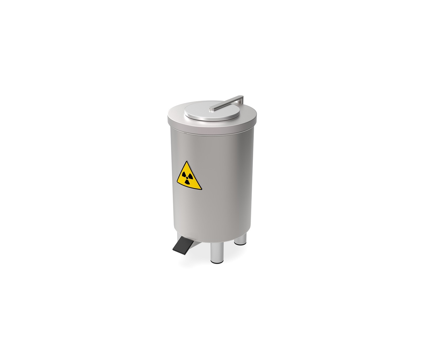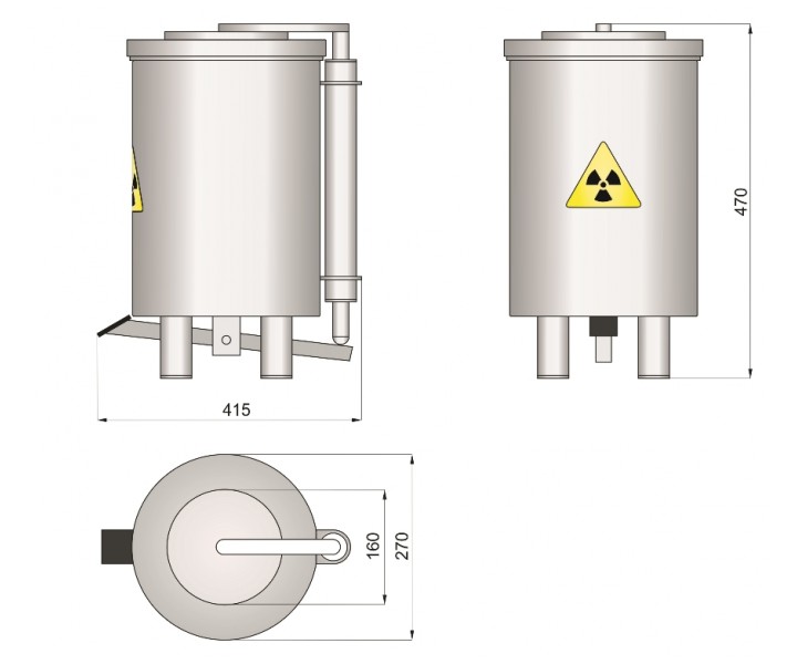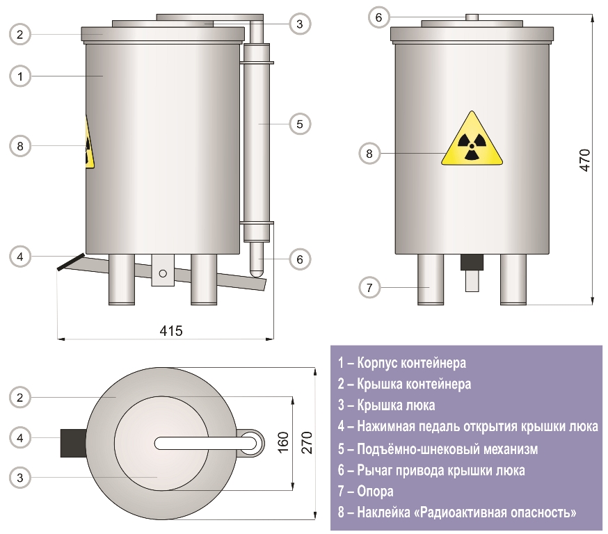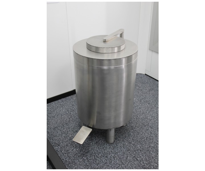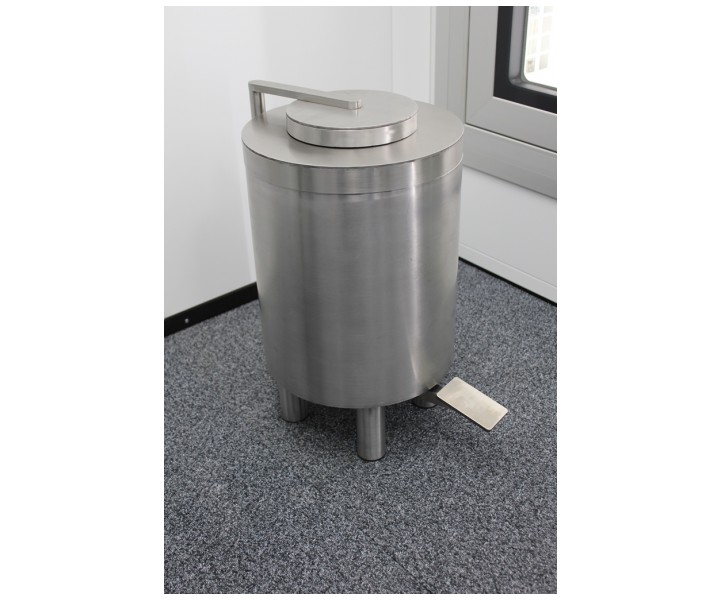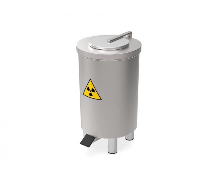 Контейнер защитный TISSA-RP предназначен для сбора твердых радиоактивных отходов и снижения уровня ионизирующего излучения. Контейнер выполнен из нержавеющей стали AISI 304 и экранирован по периметру защитным материалом (свинец). В верхней части контейнера расположен люк с крышкой. Для удобства открытия крышки предусмотрен ножной педальный механизм. При нажатии на педаль крышка люка поднимается и сдвигается в сторону, обеспечивая доступ внутрь контейнера.